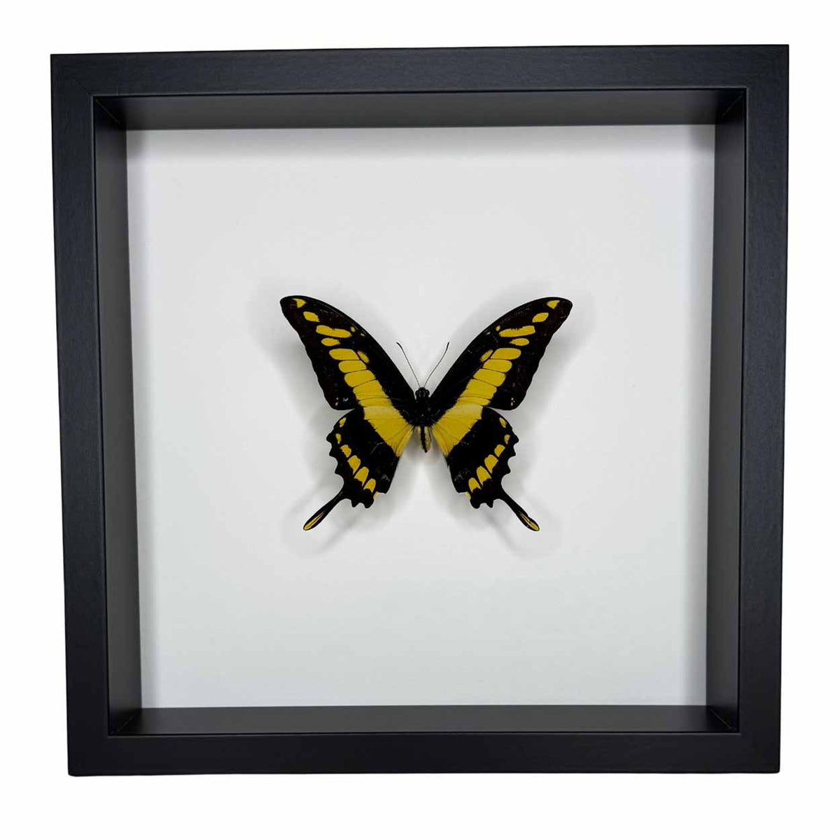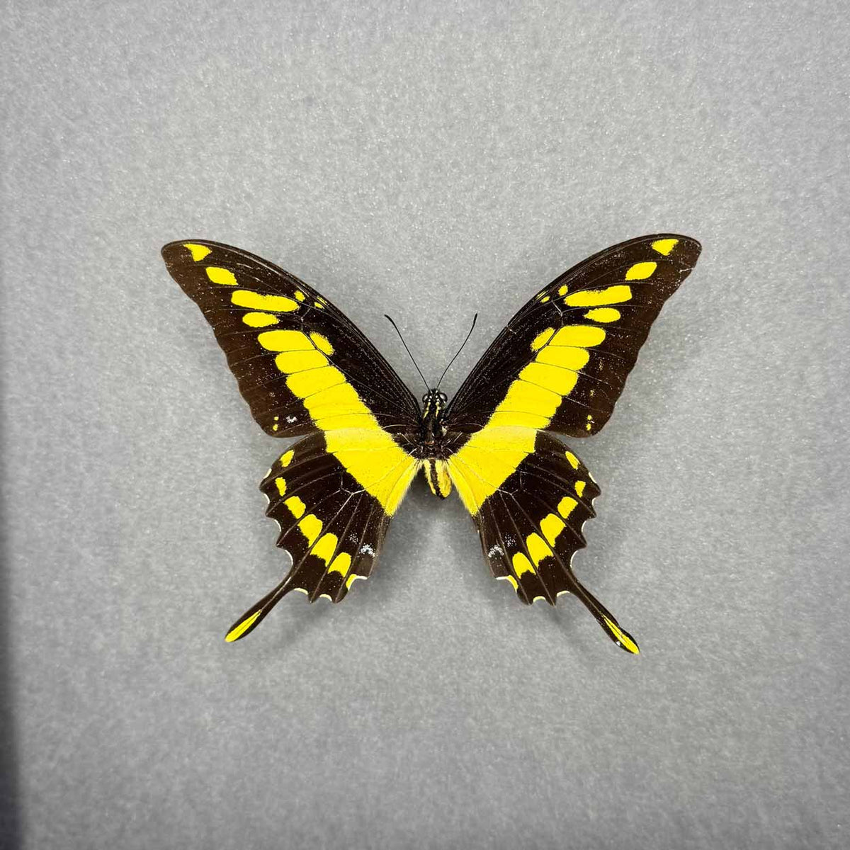 To preserve the beautiful colors and intricate patterns of the Papilio Thoas Cyneras, each butterfly is carefully mounted behind anti-UV plexiglass. This high-quality plexiglass protects against harmful UV rays, preventing fading and aging, allowing you to enjoy this exceptional specimen for years to come.